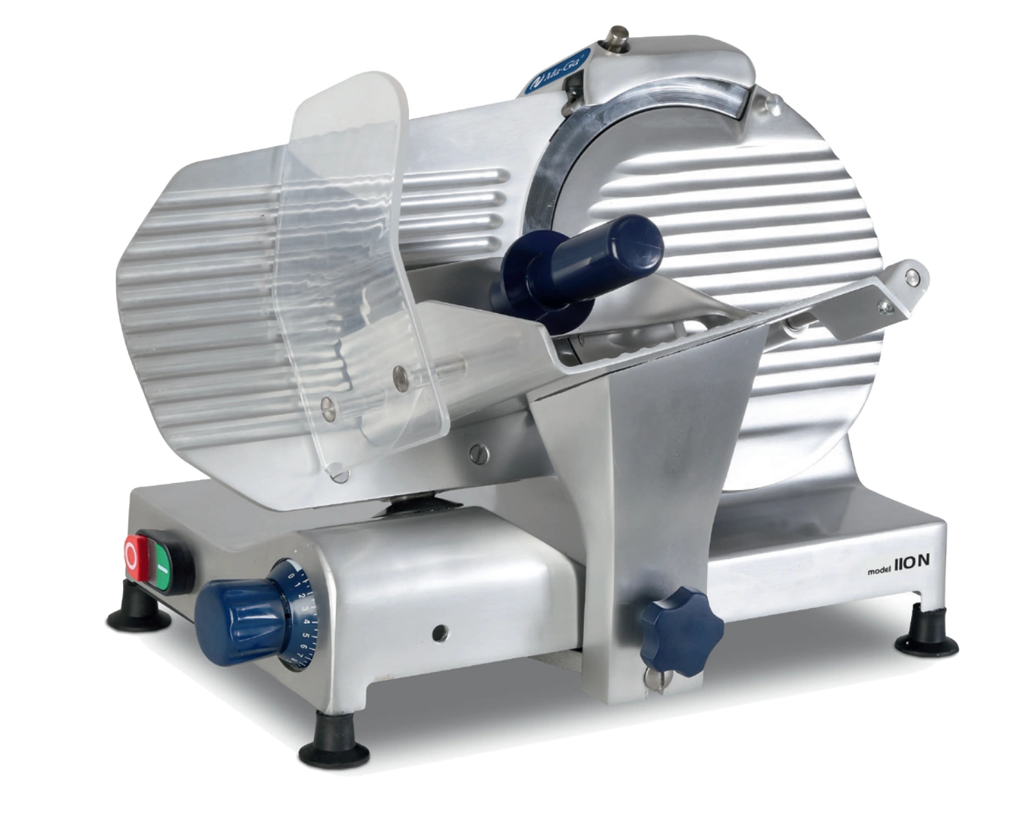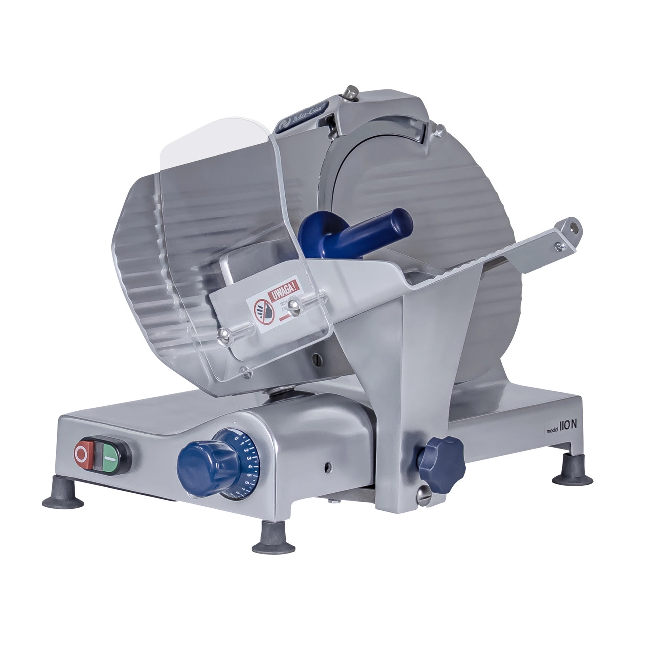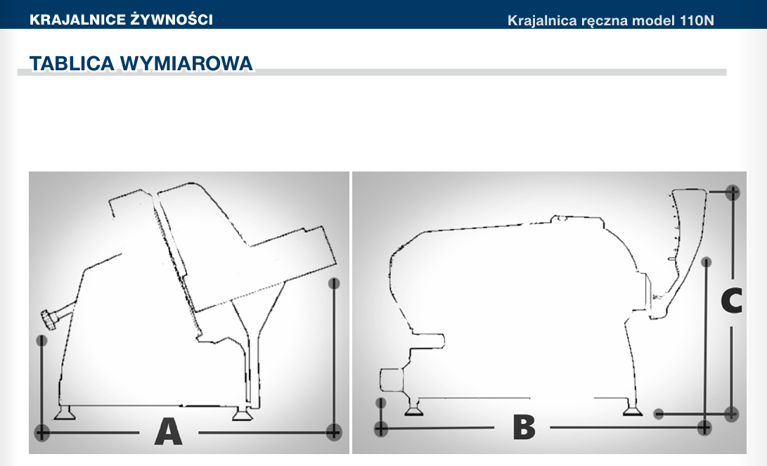 Krajalnica żywności 110N jest precyzyjną maszyną umożliwiającą krojenie żywności na plastry różnej grubości. Regulacja grubości plastra realizowana jest płynnie w zakresie od 0 do 13mm. Opływowy kształt korpusu maszyny zaprojektowany został tak aby w jak największym stopniu ułatwić utrzymanie krajalnicy w czystości. Optymalny kąt pochylenia stołu w połączeniu z odpowiednio dobranym kształtem płyty dociskowej zapewnia pewny docisk